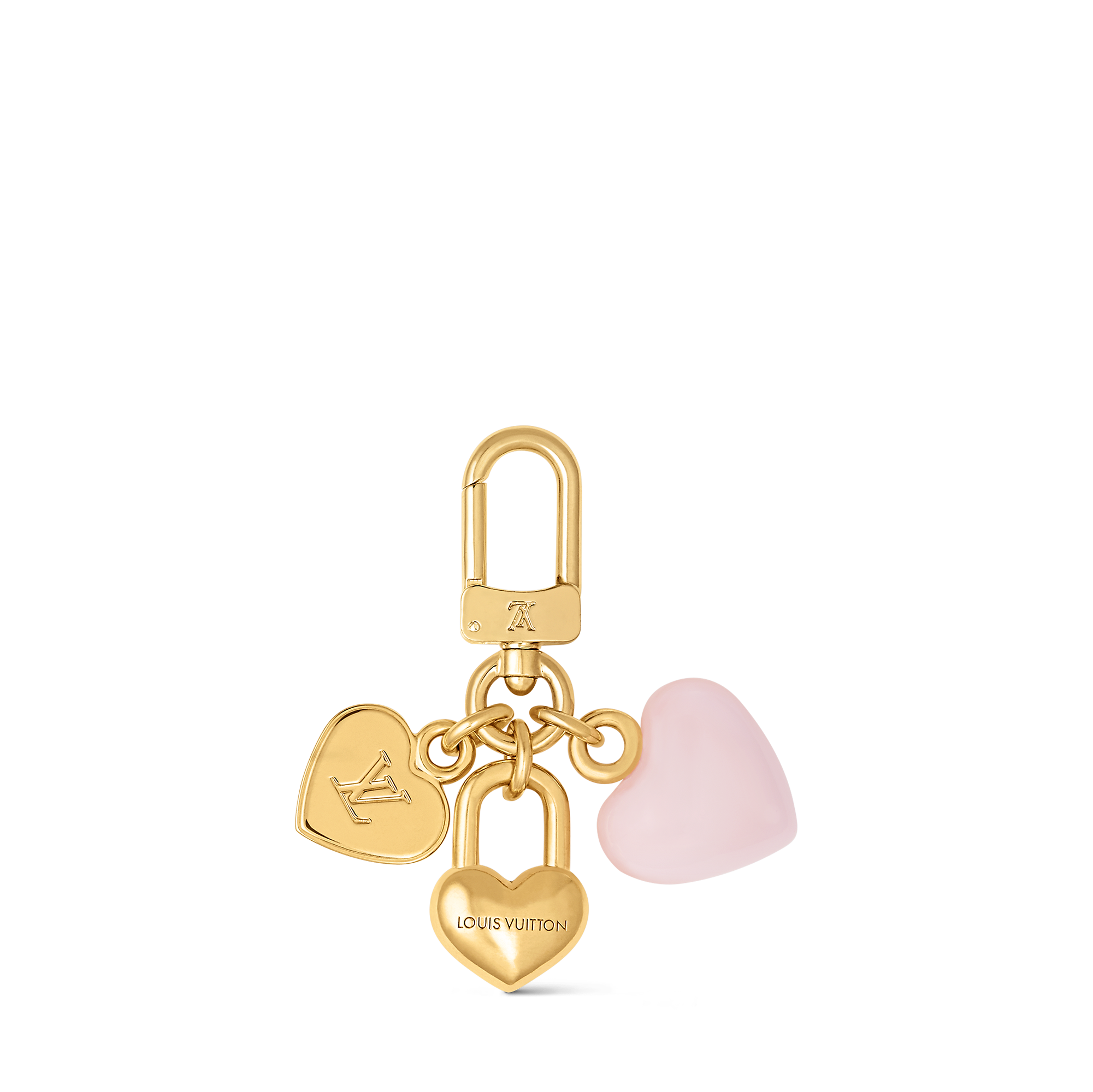 The precious and delicate Charms Heart key holder is a triple ode to romance. Suspended from a gold-tone metal snap hook are three finely detailed hearts, one featuring the Initials and another with a Paris signature. An adorable accessory that adds a touch of light and love to a key ring.